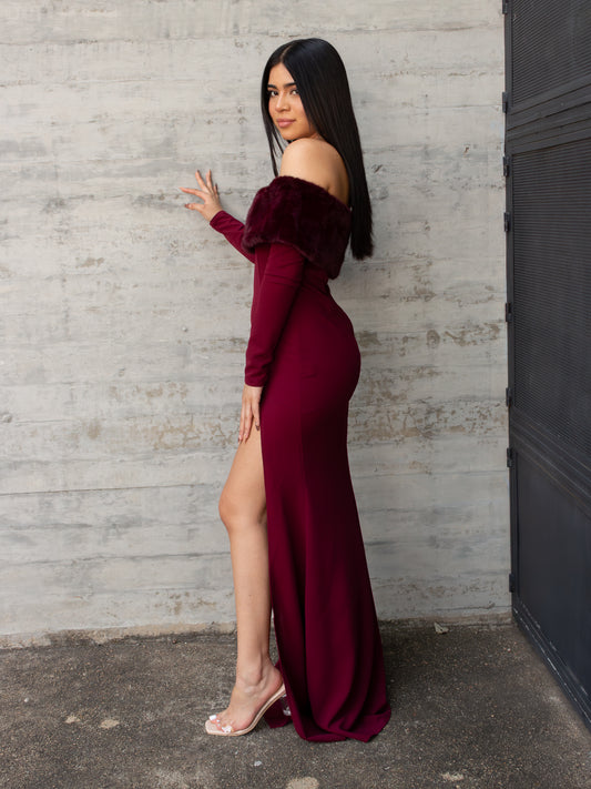 VESTIDO BURGUNDY FAUX FUR DE HOMBROS